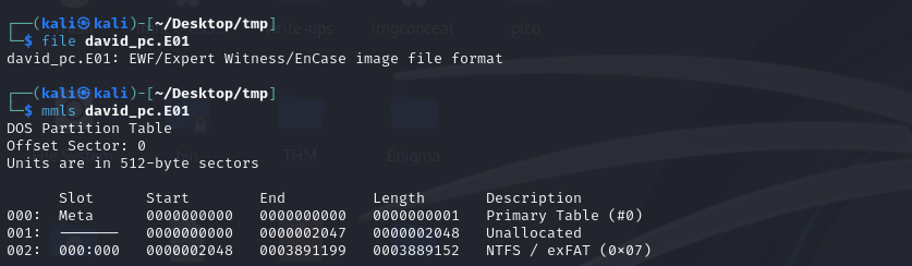 mmls david_pc.E01This command revealed a DOS Partition Table with a primary NTFS partition starting at offset 2048. From this, we could conclude that the disk image contains a NTFS filesystem, which was critical for further investigation.