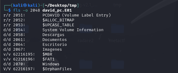 Once we identified the partition containing the NTFS filesystem, we used fls to list the files and directories present within it. The following command revealed the directory structure: