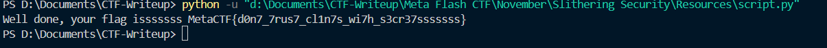 Well done, your flag isssssss MetaCTF{d0n7_7rus7_cl1n7s_wi7h_s3cr37sssssss}