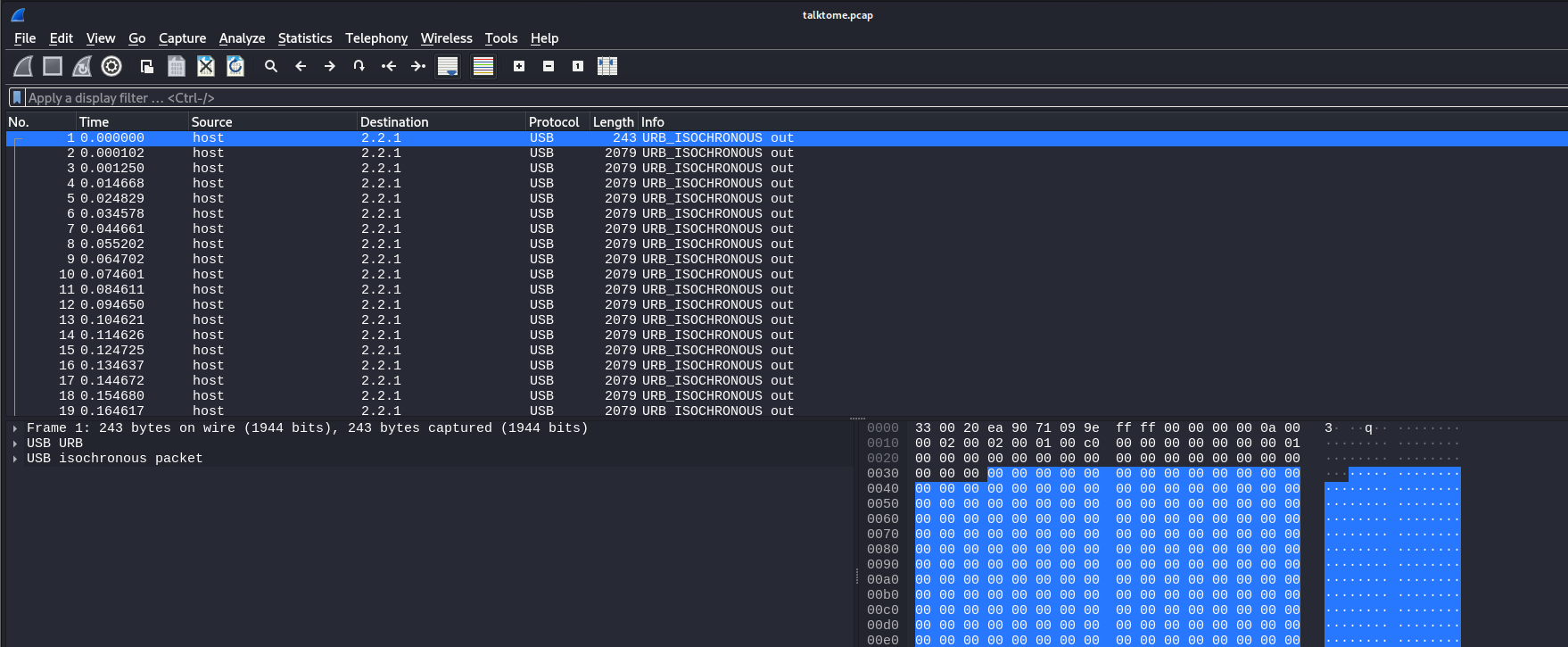 This challenge provided us with a PCAP file, talktome.pcap, which I had to analyze to uncover a hidden message. The PCAP file contained USB isochronous packets, which are typically used for streaming audio or video. Our task was to process these packets, extract the audio data, and listen to it to uncover the flag.