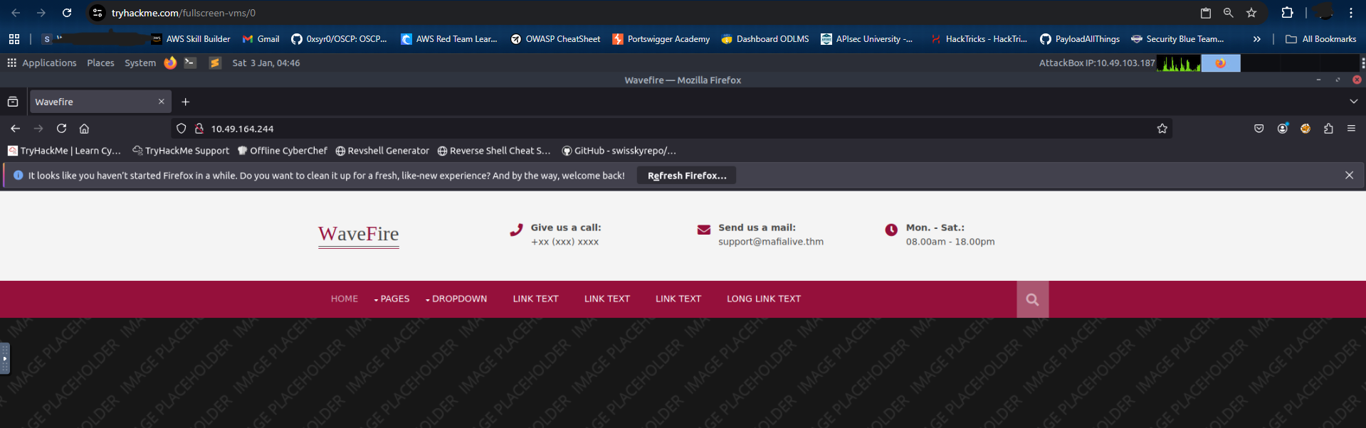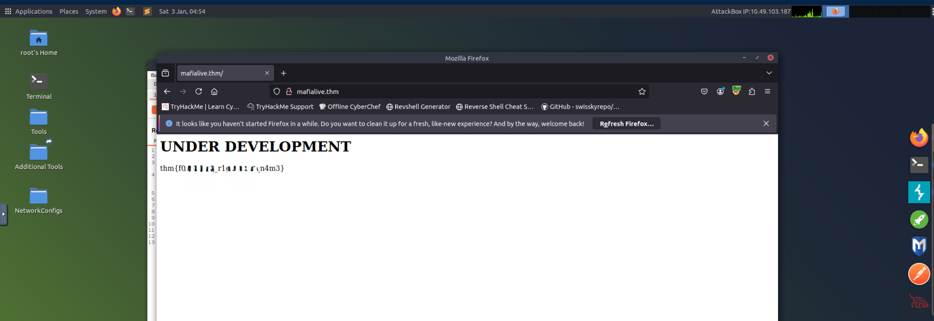 echo "TARGET_IP mafialive.thm" >> /etc/hostsNow, let's visit mafialive.thm in our browser, and as soon as we do we get our Flag 1 - thm{*redacted*}.