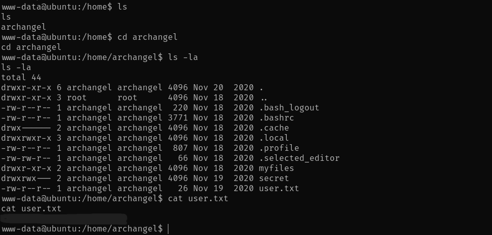 We navigate to the /home/archangel directory and find user.txt. That is the user flag - thm{REDACTED}.