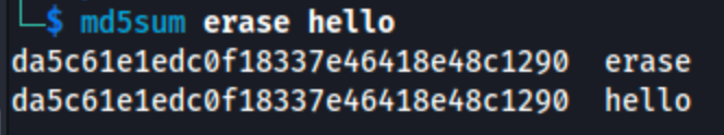 Example: Files hello and erase produce the same MD5 hash, demonstrating collision vulnerability: