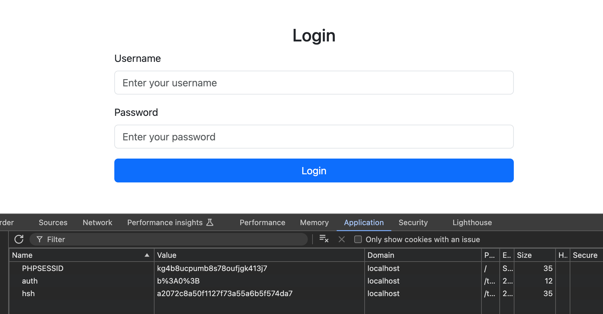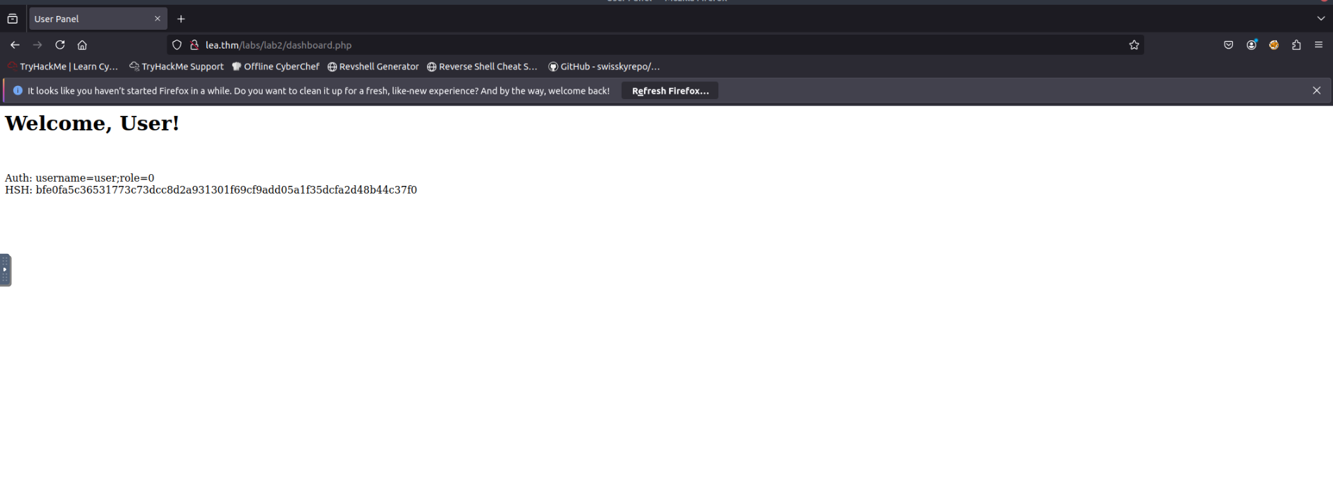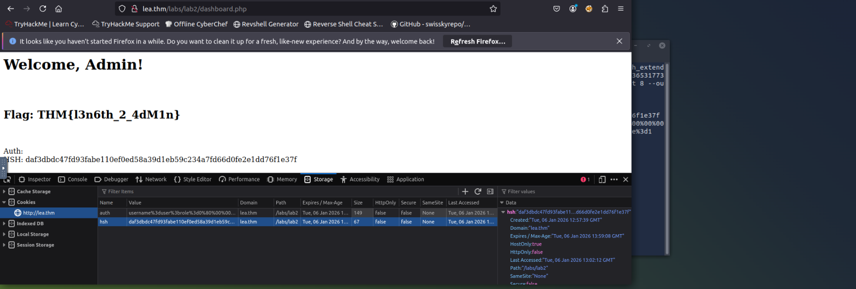 Navigate to http://lea.thm/labs/lab2/. The application uses cookies to store session tokens and authentication hashes: