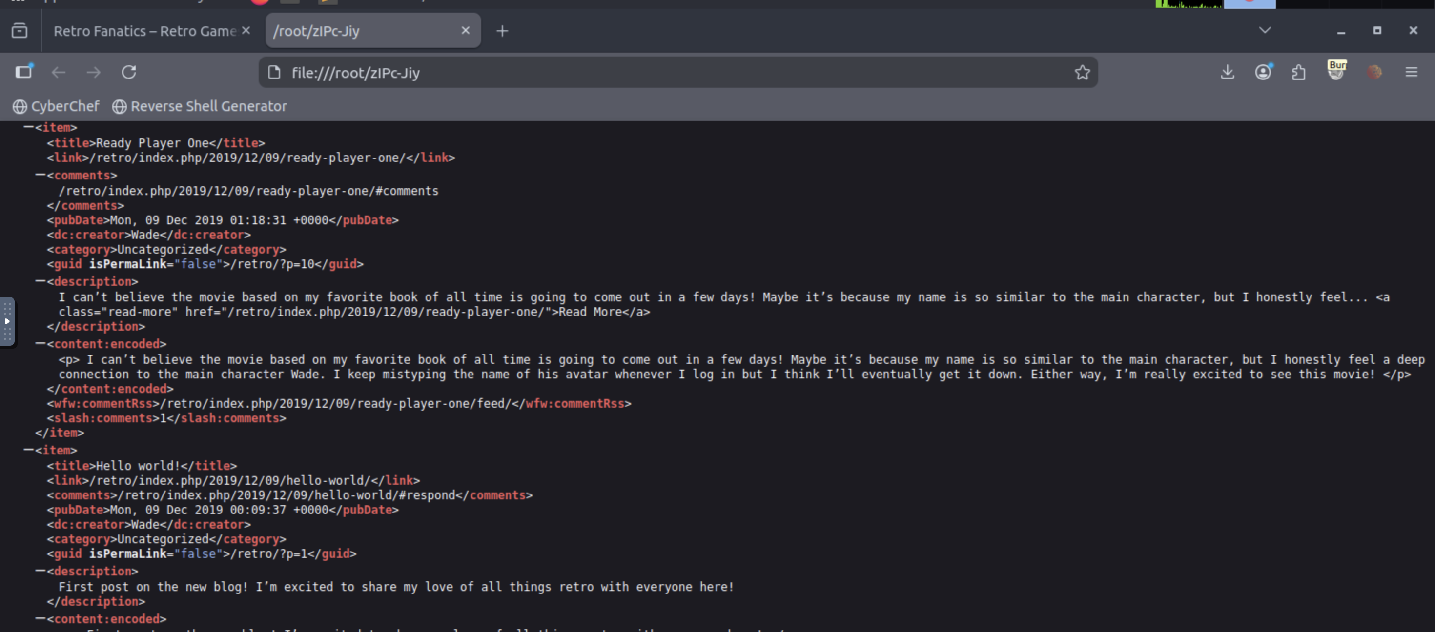 So, we visit the URL we found in the wpscan output - /<REDACTED>/index.php/feed/: