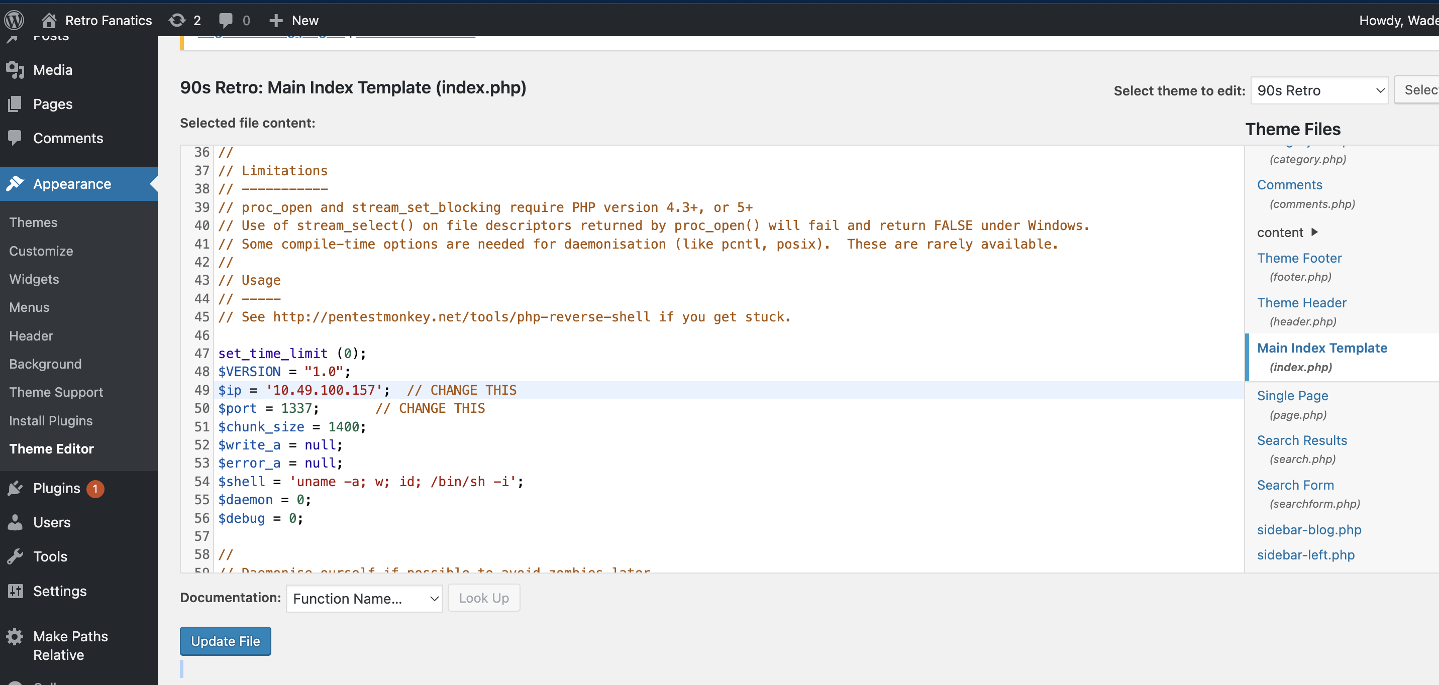 Now, we need to work towards getting a reverse shell. For which, we'll change the index.php page in Appearance > Theme Editor > index.php.