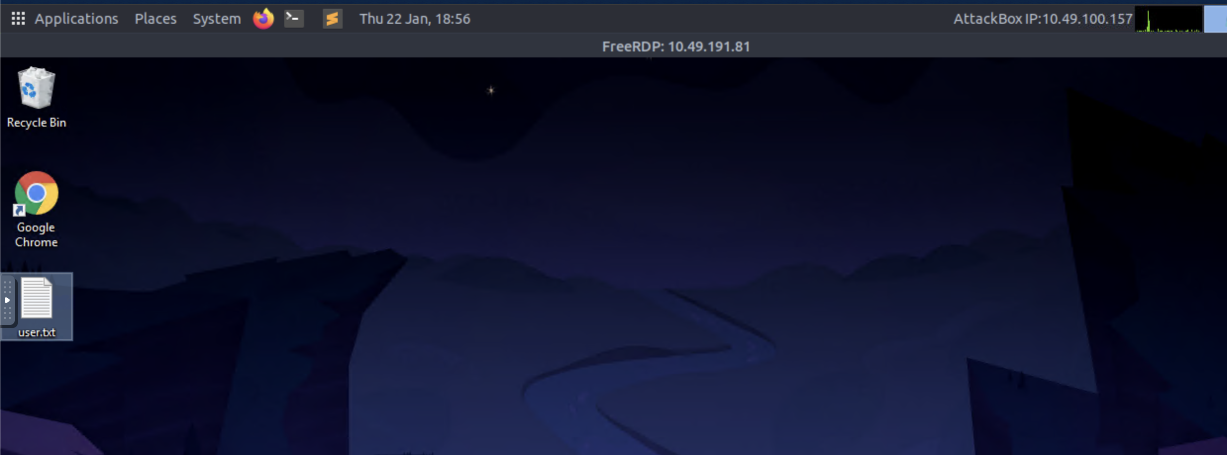 As soon as we log in via RDP, we can see the user.txt flag. That's the second answer for the room.