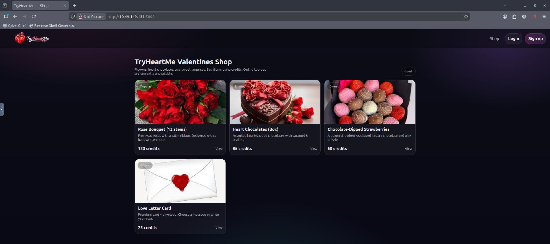 The app was at http://<TARGET_IP>:5000 β a Valentine shop with products like Rose Bouquet, Heart Chocolates, etc.